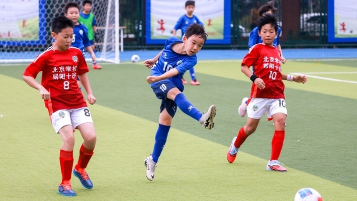 9月27日下午,小学生在“班超”赛场上大力射门。当日,北京市“校园足球主题月”在位于通州区的北京学校启动。中新社记者 贾天勇 摄