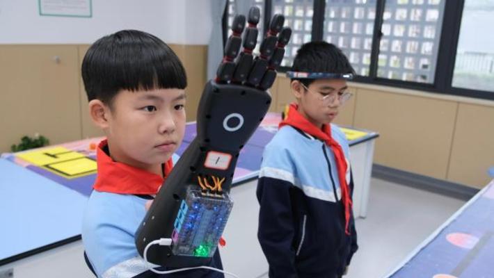 11月12日,小学生通过集中注意力控制机械手臂。日前,浙江发布《浙江省推进“人工智能+教育”行动方案(2025—2029年)》,鼓励建设新型AI学习空间。浙江省杭州市富阳区新民小学通过打造强脑科技课堂、AI智慧体育、AI互动长廊等数智实践场景,让学生在课堂内外“玩转”AI技术。中新社记者曹丹 摄