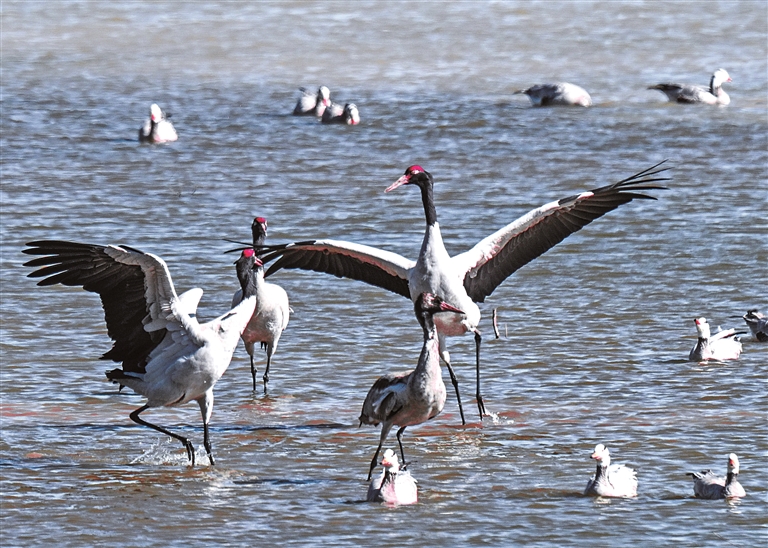 在贵州草海国家级自然保护区越冬的黑颈鹤等鸟类。新华社发